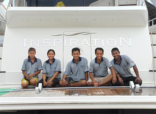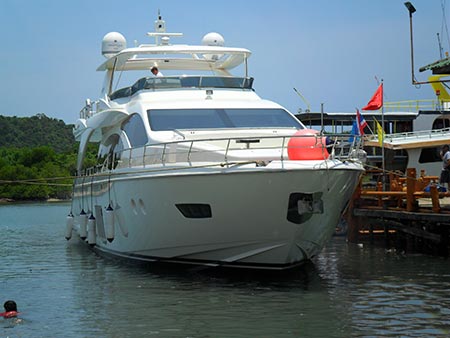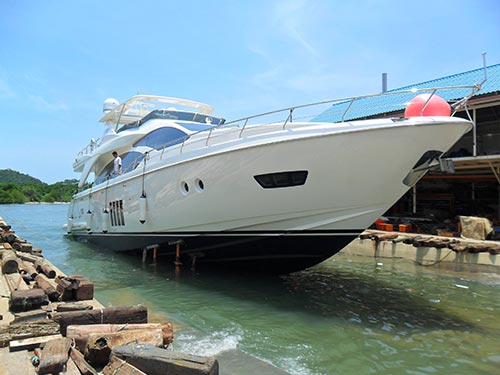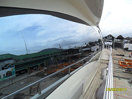 Refit of an Azimut 82 at the Ratanachai wharf, Phuket. Commissioned by Simpson Marine Asia. In September 2011 a team of Precision Shipwright Services started work on location on this mega yacht. The yacht was relaunched after weeks of intensive highest quality respraying of the hull and super structure.